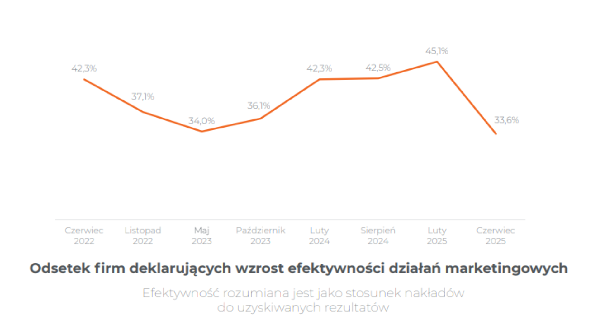 Polski kontekst tylko wzmacnia ten obraz. Raport CIMO „Ostrożność w niepewności” pokazuje, że efektywność działań marketingowych spadła w 2025 roku 12 pp. względem poprzedniej edycji badania, osiągając najniższy poziom w historii. Jedynie co trzeci marketer deklaruje wzrost efektywności. Reszta robi więcej, korzysta z bardziej zaawansowanych rozwiązań… i wyciska z tego coraz mniej.